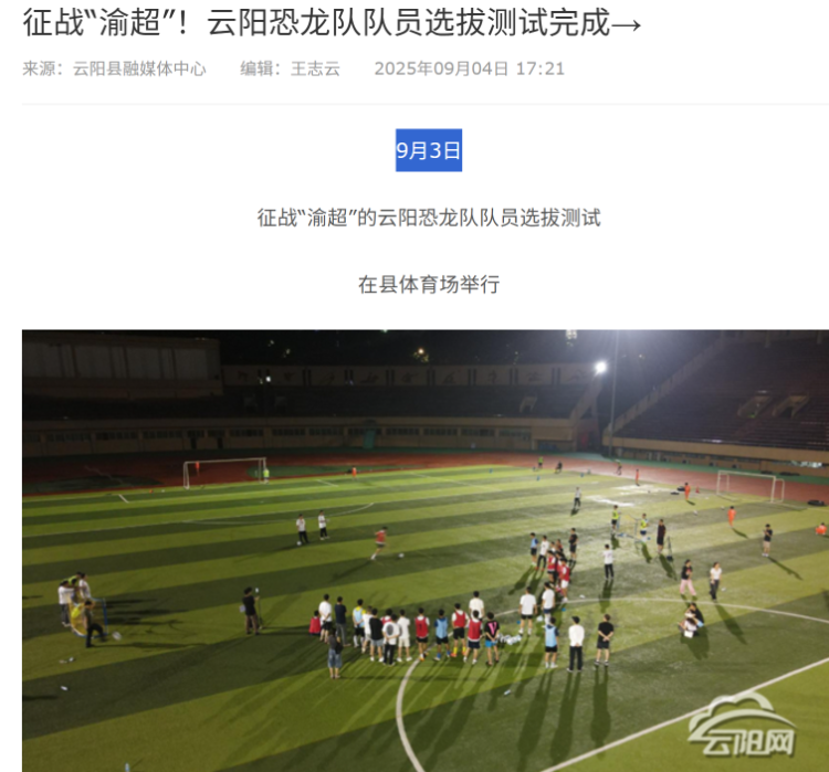 据“云阳微发布”消息,9月3日,征战“渝超”的云阳恐龙队队员选拔测试,在该县体育场举行。据介绍,本次云阳恐龙队队员选拔,是面向全县招募符合赛事报名条件、具备较高足球竞技水平的队员,共有38名足球爱好者报名参加选拔测试。由教练组分别从速度、耐力、专项技术和比赛能力四个维度进行评估。