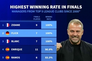 体育资讯4月29日讯 德国转会市场统计了本世纪五大联赛教练在决赛中的胜率,并列出榜单,齐达内、弗里克、布兰科胜率100%居首。