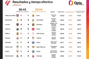 体育资讯8月26日讯 Opta统计了西甲第二轮的净比赛时间,马竞vs埃尔切净比赛时间63分09秒最长,皇家奥维耶多vs皇马、莱万特vs巴萨二三位。